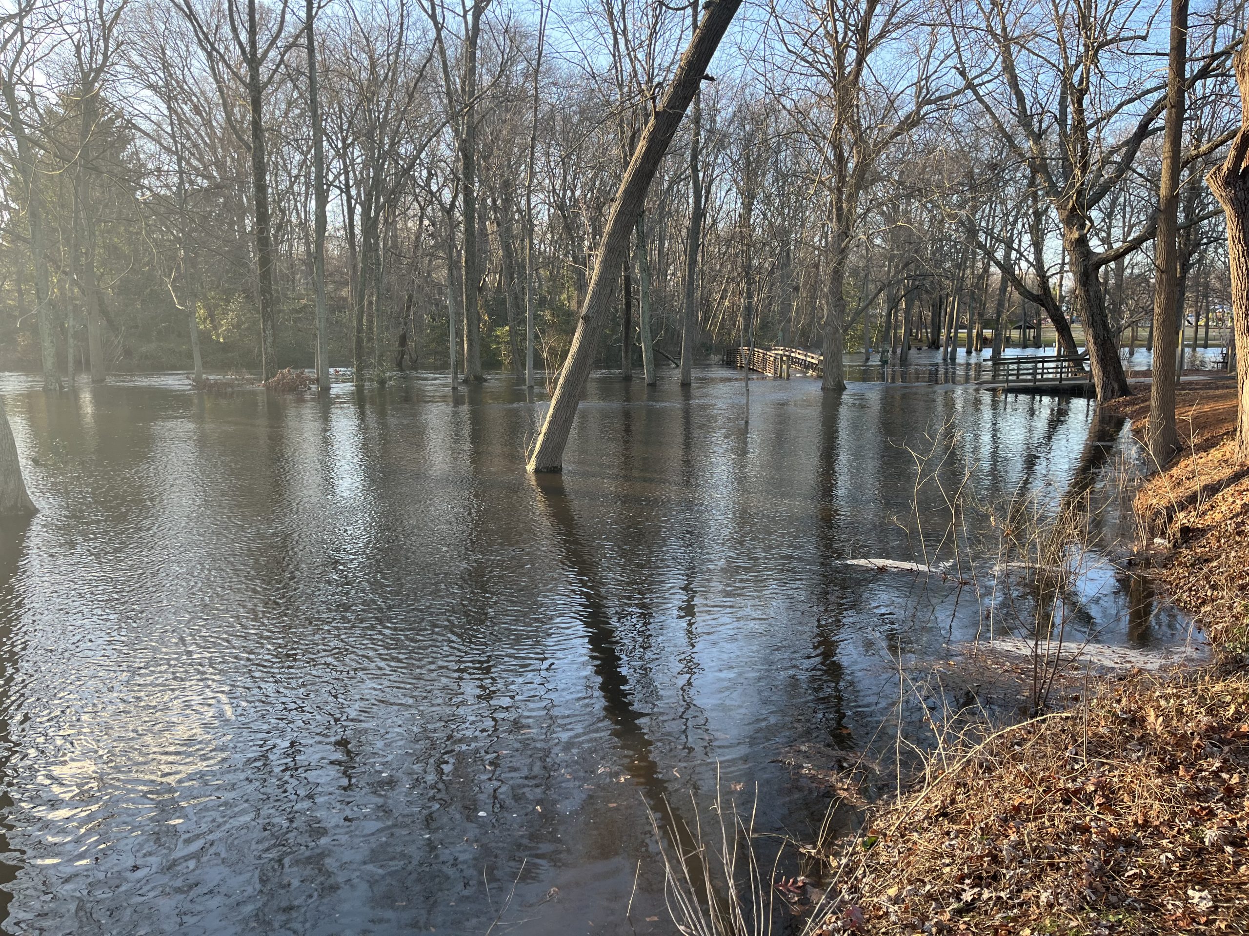 Photos of flooding on Dec 18, 2023, in Sliver Lake Park and six days later. The spillway from the dam at Silver Lake is the beginning of the St. Jones River, which discharges in the Delaware Bay just north of Bowers Beach, Del. PHOTOS BY DAVE WOLANSKI