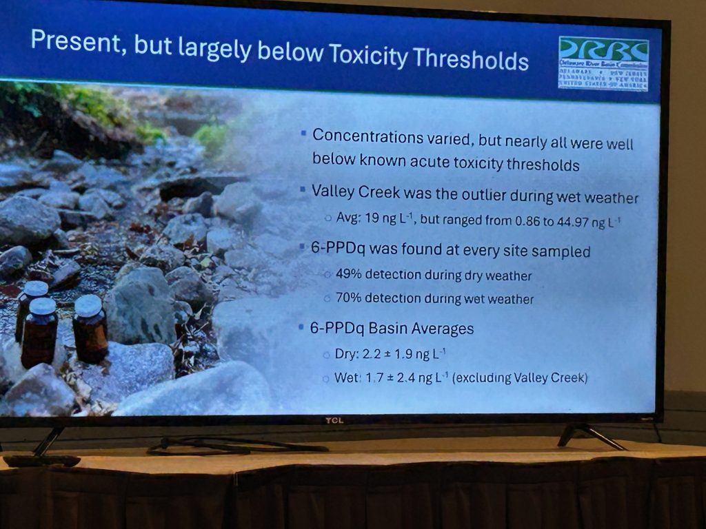 The findings, presented by Jeremy Conkle, a senior chemist and toxicologist with the Delaware River Basin Commission, offered a mixed outlook: On the one hand, the levels detected at sites in the watershed were mostly below acute toxicity levels. However, the long-term effects to fish of prolonged exposure to sub-lethal levels of the chemical remain unknown.