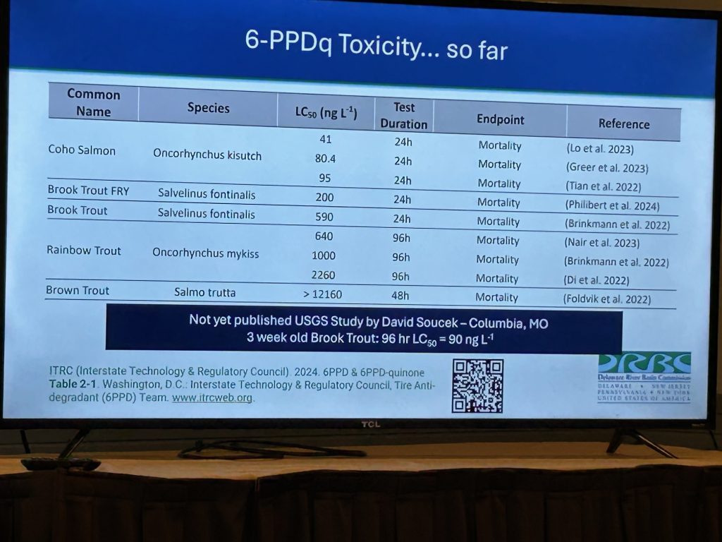 The tongue-twister of a chemical, 6-PPDq, is a byproduct of a polymer that has been added to rubber tires since the 1960s to slow their erosion from dry rot and prevent catastrophic blowouts at high speeds, Conkle said on Wednesday at one of several presentations at the Upper Delaware River Rendezvous, organized by the Friends of the Upper Delaware that was held at the Villa Roma Resort in Callicoon, N.Y.